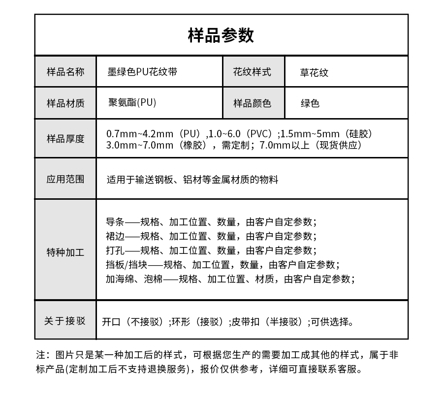 • 產(chǎn)品名稱:墨綠色PU輸送帶花紋食品輸送帶定制加工