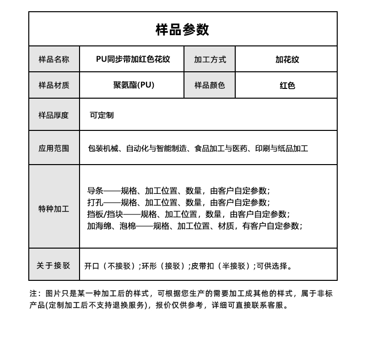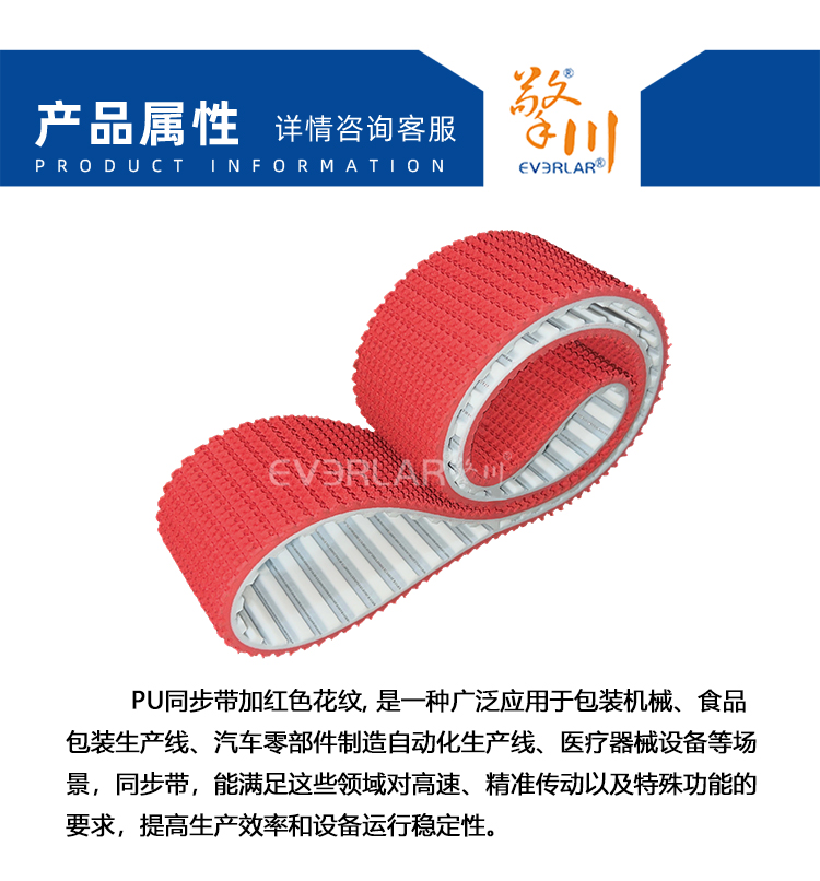 • 產(chǎn)品名稱:PU同步帶加紅色花紋食品包裝自動化生產(chǎn)線聚氨酯工業(yè)皮帶